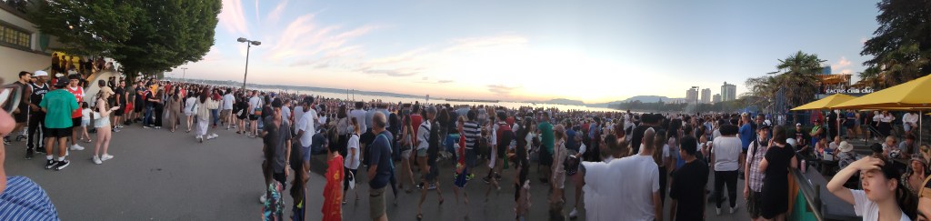 The size of the crowds were massive! So much so, that Eric and I stationed ourselves close to an exit for a quick escape once the program was over. We weren’t being too paranoid about catching COVID here and could have easily worn a mask as some did at the event. Honestly, with the amount of cannabis wafting in the air, it would have been easier to catch a contact high than COVID. Which would probably explain why I was craving a bag of Nacho Cheese Doritos as we walked back to our hotel. Luckily this was Canada where more than 85% of Canadians have been vaccinated and the Celebration of Light was an outdoor event.
